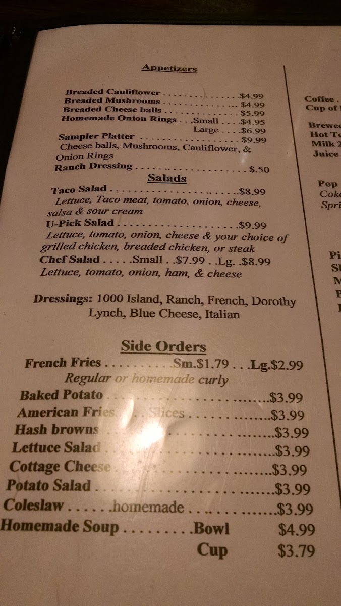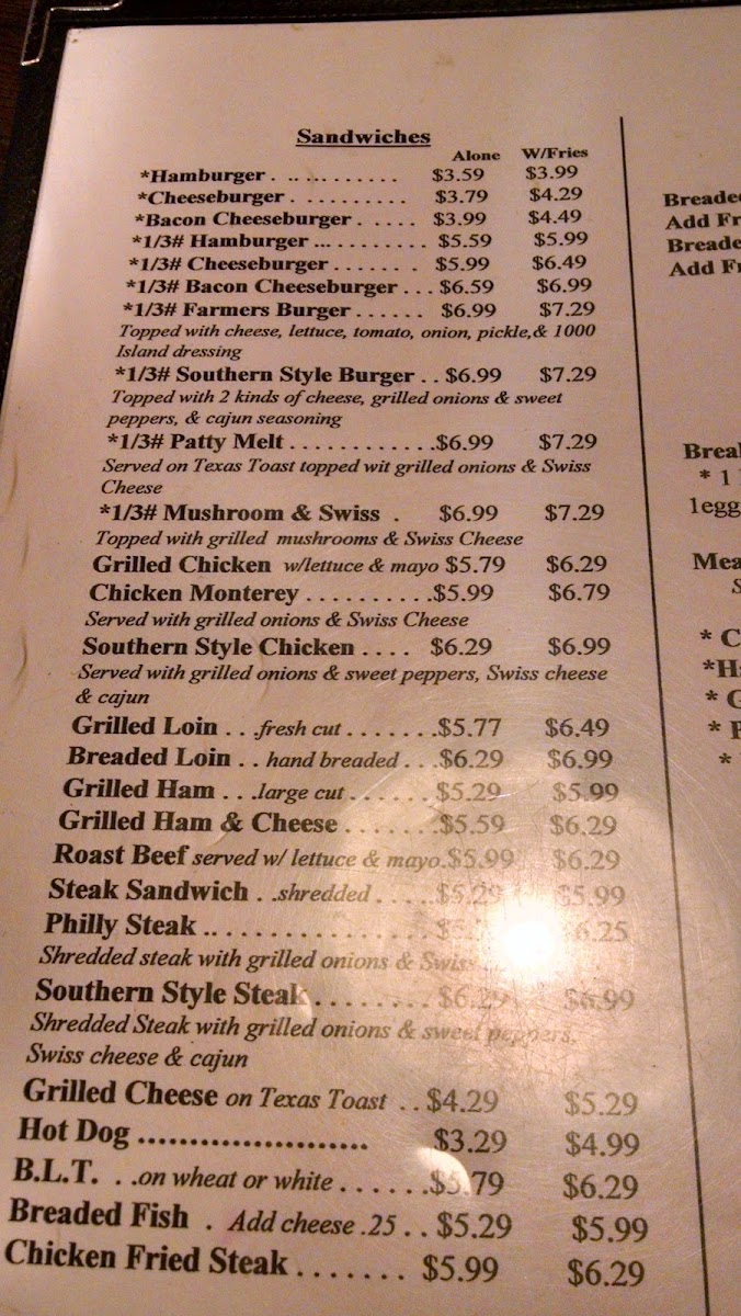 Burgers steal the spotlight here—from the simple yet satisfying 1/3# Hamburger to specialty creations like the Farmers Burger, topped with cheese, lettuce, tomato, onion, pickle, and 1000 Island dressing, or the Southern Style Burger, featuring grilled onions, sweet peppers, and Cajun seasoning for a kick. Sandwich options range from comforting grilled cheeses to classic peanut butter and jelly, while meals like chicken strips and breaded shrimp round out the diverse offerings.